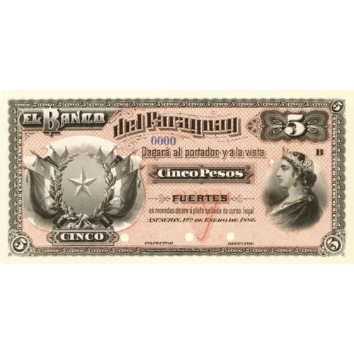 | Obverse lettering | EL BANCO Del Paraguay Pagará al portador y á la vista Cinco Pesos FUERTES en monedas de oro ó plata sellada de curso legal. ASUNCIÓN, 1ro. de Enero de 1882. (Translation: The Bank of Paraguay Will pay to bearer, at sight, Five Pesos Fuertes in coins of gold or sealed silver, of legal tender. Asunción, January 1st., 1882.) |