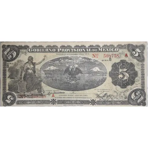 | Obverse lettering | VERACRUZ DECIEMBRE 1º DE 1914 LA TESORERIA RECIBIRA Y PAGARA ESTE BILLETE DE ACUERDO CON EL DECRETO 19 DE SEPTIEMBRE DE 1914. MEXICO OFICINA DEL GOBIERNO (Translation: Provisional Government of Mexico Veracruz December 1st, 1914 The treasury will recieve and pay this bill in accordance with the decree of 19 September 1914) |