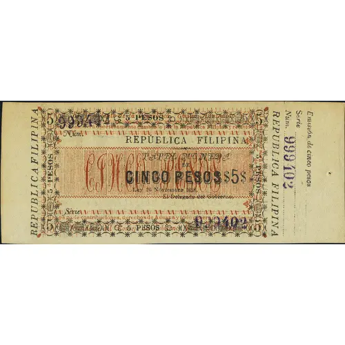| Reverse lettering | EL PRESIDENTE DE LA REPUBLICA EMILIO AGUINALDO ESTE BILLETE SERA OPORTAMENTE CAMBIADO POR LA REPUBLICA FILIPINA Y RECIBIDO REPUBLICA DE FILIPINAS CINCO PESOS REPUBLICA DE FILIPINAS EN PAGO DE CONTRIBUCIONES, DERECHOS DE ADUANA Y TODO GENERO DE OBLIGACIONES EL PRESIDENTE DEL CONSEJO DE GOBIERNO, PEDRO A. PATERNO EL FALSIFICADOR SERA CASTIGADO CON TODO EL RIGOR DE LA LEY (Translation: The President of the Republic Emilio Aguinaldo. This ticket will be exchanged and received by the Philippine Republic in payment of taxes, customs duties and all kind of obligations. Republic of the Philippines Five pesos The President of the Governing Council Pedro A. Paterno The counterfeiter will be punished with the full rigor of the law) |