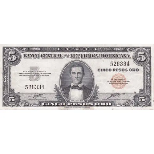 5 BANCO CENTRAL DE LA REPUBLICA DOMINICANA 5 CINCO PESOS ORO ESTE BILLETE TIENE FUERZA LIBERATORIA PARA EL PAGO DE TODAS LAS OBLIGACIONES PUBLICAS O PRIVADAS CIUDAD TRUJILLO DISTRITO NACIONAL REPUBLICA DOMINICANA 5 SANCHEZ 5 CINCO PESOS ORO (Translation: 5 Central Bank of the Dominican Republic 5 Five Pesos Oro This note has liberatory force for payment of al debts public or private Ciudad Trujillo National District Dominican Republic 5 Sánchez 5 Five Pesos Oro) |