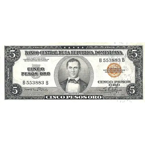 (Translation: 5 Central Bank of the Dominican Republic 5 Five Pesos Oro This note has liberatory force for payment of al debts public or private Ciudad Trujillo National District Dominican Republic 5 Sánchez 5 Five Pesos Oro)