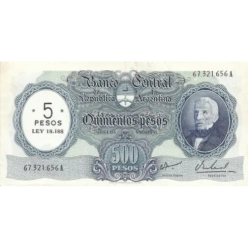 | Obverse lettering | 5 PESOS LEY 18.188 Banco Central de la Republica Argentina Quinientos Pesos Moneda Nacional 500 Pesos (Translation: 5 Pesos Law 18,188 Central Bank of the Argentinian Republic Five Hundred pesos National currency 500 Pesos) |