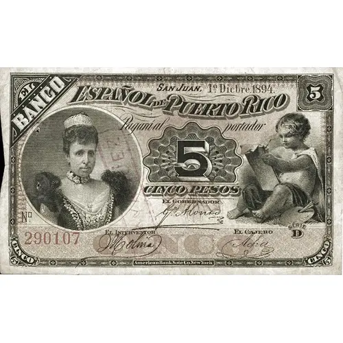 | Obverse description | Black on brown and yellow underprint. Portrait Queen mother and regent of Spain`s Maria Christina at left. Seated child painting at right. |