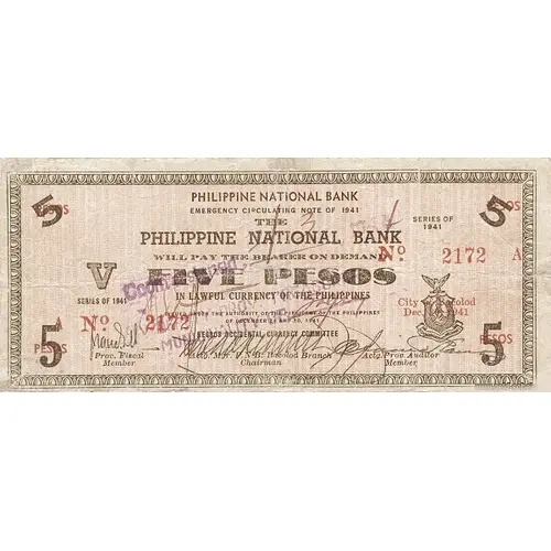 PHILIPPINE NATIONAL BANK EMERGENCY CIRCULATING NOTE OF 1941 THE PHILIPPINE NATIONAL BANK WILL PAY THE BEARER ON DEMAND FIVE PESOS IN LAWFUL CURRENCY OF THE PHILIPPINES ISSUED BY AUTHORITY OF THE PRESIDENT OF THE PHILIPPINES OF DECEMBER 29 AND 30 1941 NEGROS OCCIDENTAL CURRENCY COMMITTEE |
