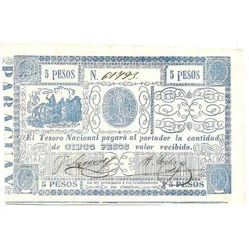 5 PESOS REPÚBLICA DEL PARAGUAY El Tesoro Nacional pagará al portador la cantidad de CINCO PESOS valor recibido. La ley perseguirá á los falsificadores y sus cómplices (Translation: 5 Pesos Republic of Paraguay The National Treasury will pay to the bearer the amount of Five Pesos received value. The law will prosecute counterfeiters and their accomplices.) |