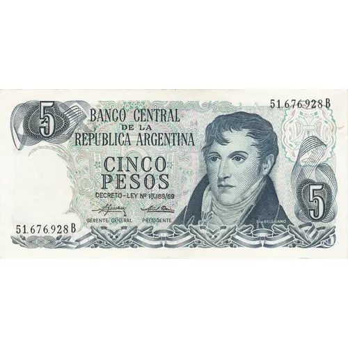 | Obverse lettering | BANCO CENTRAL DE LA REPUBLICA ARGENTINA CINCO PESOS DECRETO-LEY N°18.188/69 5 (Translation: Central Bank of the Argentine Republic Five Pesos Decree-Law no. 18,188/69 5) |