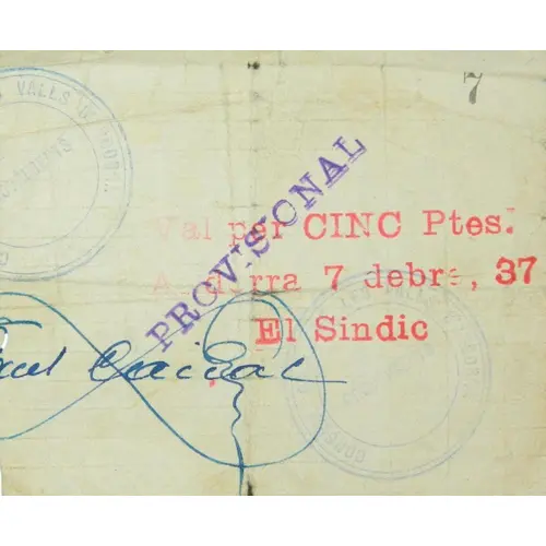| Obverse lettering | Val per CINC Ptes. Andorra 7 debre. 37 El Sindic Provisional CONSELL GENERAL DE LES VALLS D`ANDORRA - PROVEÏMENTS (Translation: Voucher for Five Pesetas Andorra, December 7, 1937 The `Sindic` Provisional General Council of the Valleys of Andorra - Supplies) |