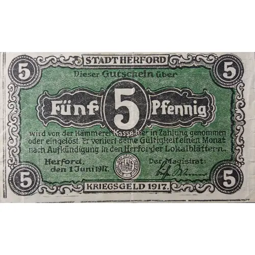 Obverse lettering STADT HERFORD 5 5 5 5 Dieser Gutschein über Fünf 5 Pfennig wird von der Kämmerei Kasse hier in Zahlung genommen oder eingelöst. Er verliert seine Gültigkeit einen Monat nach Aufkündigung in den Herfordet Lokalblätten. Herford den 1 Juni 1917 Der Magistrat: KRIEGSGELD 1917
