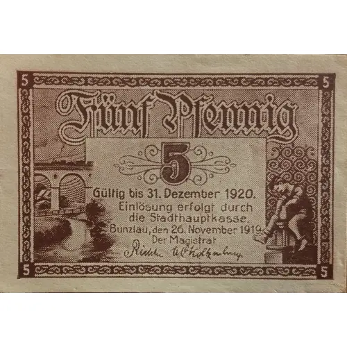 | Obverse lettering | 5 5 5 5 Fünf Pfennig 5 Gültig bis 31. Dezember 1920. Einlösung erfolgt durch die Stadthauptkasse. Bunzlau, den 26. November 1919 Der Magistrat |
