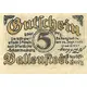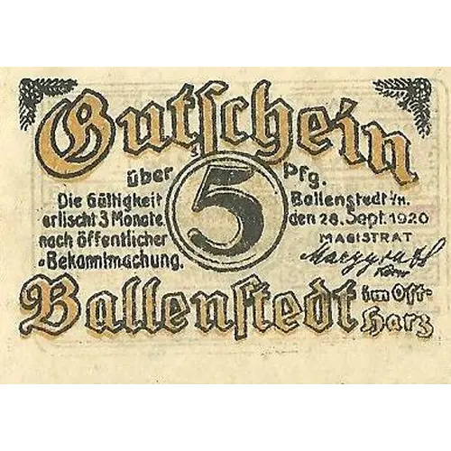Gutschein über 5 Pfg. Die Gültigkeit erlischt 3 Monate nach öffentlicher Bekanntmachung. Ballenstedt I/H. den 28. Sept. 1920 Magisrat Ballenstedt im Ost- harz (Translation: 5 Denkmal Albrecht d. Bär 5) |