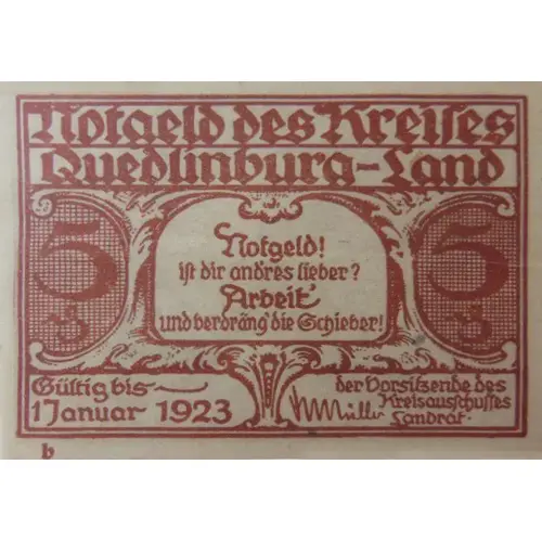 Notgeld des Kreises Quedlinburg-Land 5 Pfg. Notgeld! ist dir and`res lieber? Arbeit´ und verdräng` die Schieber! Gültig bis 1 Januar 1923 Der Vorsitzende des Kreisausschusses Landrat (Translation: Notgeld of the district of Quedlinburg-Land 5 pfennigs Notgeld! do you prefer something else? work´ and suppress the unscrupulous casual dealer! Valid until January 1, 1923 The chairman of the district committee District Administrator) |