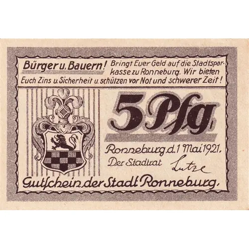 | Vorderseitenlegende | Bürger u. Bauern! Bringt Euer Geld auf die Stadtspar- kasse zu Ronneburg. Wir bieten Euch Zins u. Sicherheit u. schützen vor Not u. schwerer Zeit! 5 Pfg. Ronneburg d. 1. Mai 1921 Gutschein der Stadt Ronneburg |