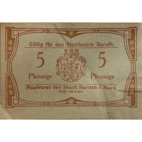 | Obverse lettering | Gültig für den Stadtbezirk Baruth 5 Pfennige 5 Pfennige Magistrat der Stadt Baruth l. Mark Schlemann |