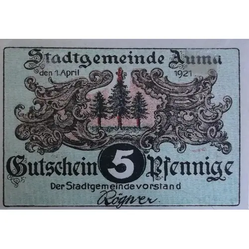 | Obverse lettering | Stadtgemeinde Auma den 1. April 1921 Gutschein 5 Pfennige Der Gemeindevorstand Rögner |