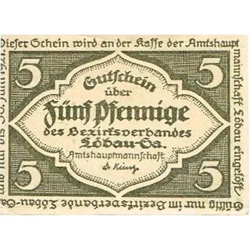 | Obverse lettering | Gutschein über Fünf Pfennige des Bezirksverband Löbau-Sa. Amtshauptmannschaft |