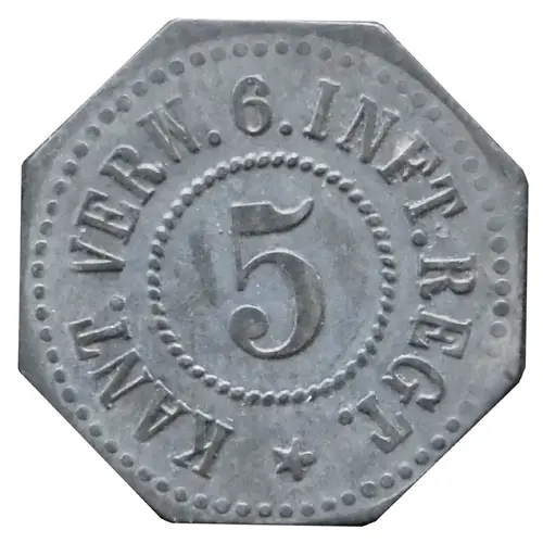 | Obverse lettering | KANT. VERW. 6. INFT. REGT. 5 ★ |