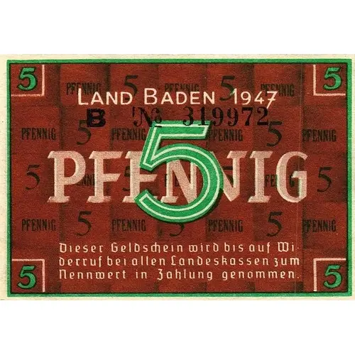 | Obverse lettering | LAND BADEN 1947 5 PFENNING Dieser Geldschein wird bis auf Widerruf bei allen Landeskassen zum Nennwert in Zahlung genommen (Translation: This banknote will be accepted at face value at all state treasuries until revoked) |