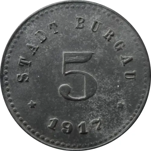 | Obverse lettering | STADT BURGAU 5 ★ 1917 ★ |