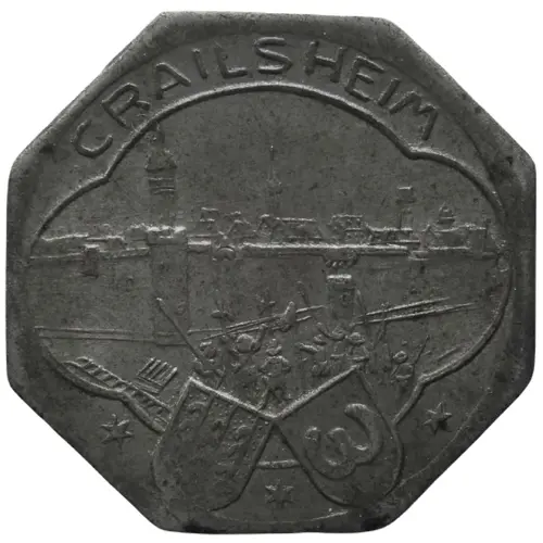 | توضیحات روی سکه | City name above view of Crailsheim with two Coat of Arms at bottom |
