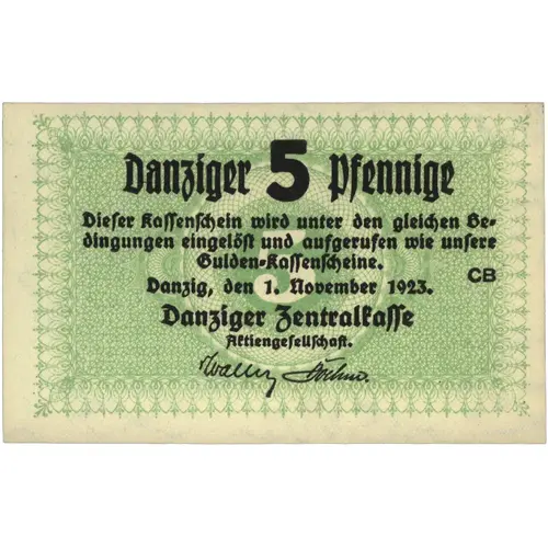 Lettering (regular font): DANZIGER 5 PFENNIGE Dieser Kassenschein wird unter den gleichen Be- dingungen eingelöst und aufgerufen wie unsere Gulden-Kassenscheine Danzig, den 22. Oktober 1923 Danziger Zentralkasse Aktiengesellschaft |