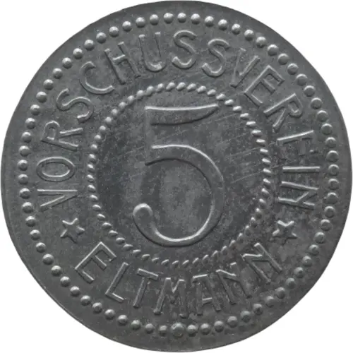 | Obverse lettering | VORSCHUSSVEREIN 5 ★ ELTMANN ★ |