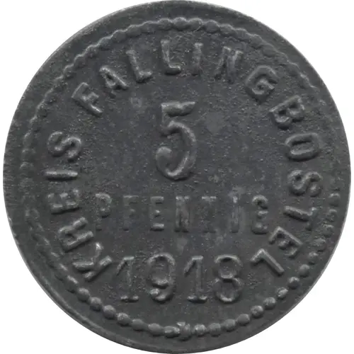 | Obverse lettering | KREIS FALLINGBOSTEL 5 PFENNIG 1918 |