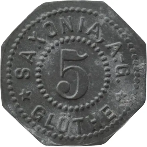 | Obverse lettering | SAXONIA, A.-G. 5 ★ GLÖTHE ★ |