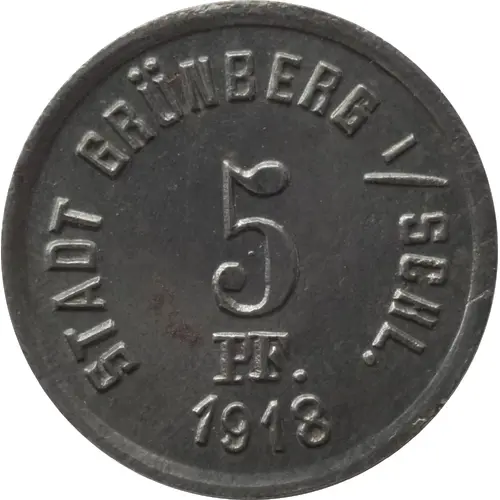 | Legenda do anverso | STADT GRÜNBERG I/SCHL 5 PF. 1918 |