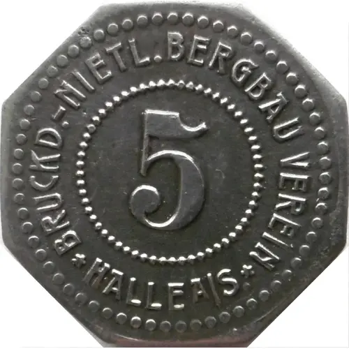 | Obverse lettering | BRUCKD.-NIETL BERGBAU VEREIN 5 ★HALLE A/S★ |
