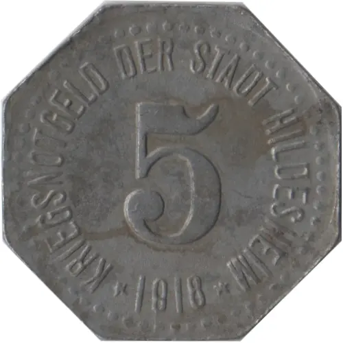 | Chữ khắc mặt trước | KRIEGSNOTGELD DER STADT HILDESHEIM 5 ★ 1918 ★ |