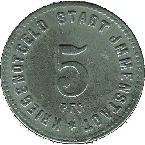 | Obverse lettering | KRIEGSNOTGELD STADT JMMENSTADT 5 PFG ✶ |