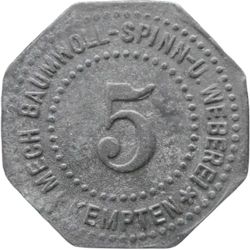 Historical Context: This 5 Pfennig from Kempten exemplifies German Notgeld, emergency currency issued during or immediately after World War I. Its zinc composition and lack of a year place it within this era of severe economic disruption and material shortages. Kempten, a Bavarian city, like many municipalities, issued localized pieces for small change. The "Mechanische Baumwollspinnerei" (Mechanical Cotton Mill) reference links it directly to Kempten's industrial economy, vital for local commerce amidst hyperinflation.