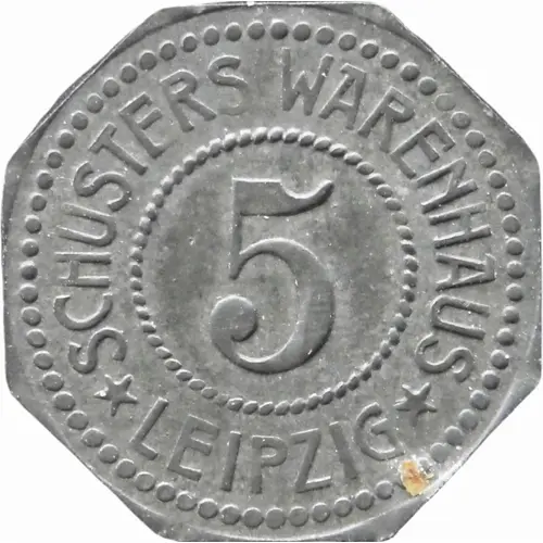 | Obverse lettering | SCHUSTERS WARENHAUS 5 ★ LEIPZIG ★ |