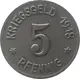 | Reverse lettering | KRIEGSGELD 1918 5 ✶ PFENNIG ✶ |