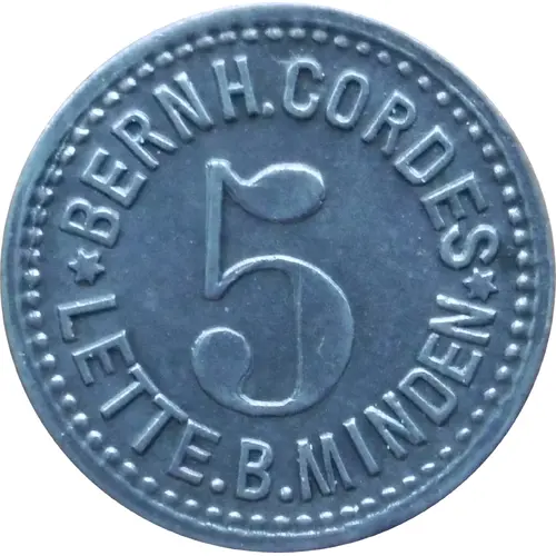 | Obverse lettering | BERNH. CORDES 5 ★ LETTE.B.MINDEN ★ |