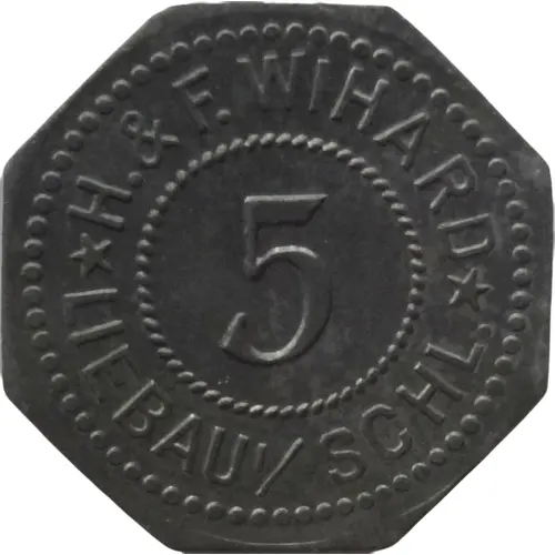 | Obverse lettering | H. & F. WIHARD 5 ★ LIEBAU i/SCHL. ★ |