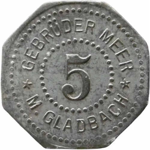 | Obverse lettering | GEBRÜDER MEER 5 ★ M. GLADBACH ★ |