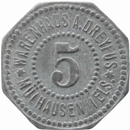 | Obverse lettering | WARENHAUS A. DREYFUS 5 ✶ MÜLHAUSEN i/ELS. ✶ |