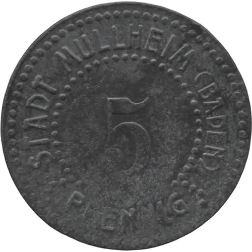 | Obverse lettering | STADT MÜLLHEIM (BADEN) 5 PFENNIG |