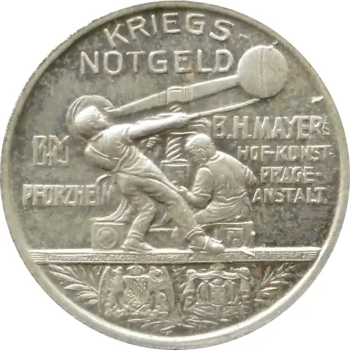 | Opis líce | KRIEGS-NOTGELD BM PFORZHEIM B.H. MAYER`s HOF-KUNST-PRÄGE- ANSTALT. |