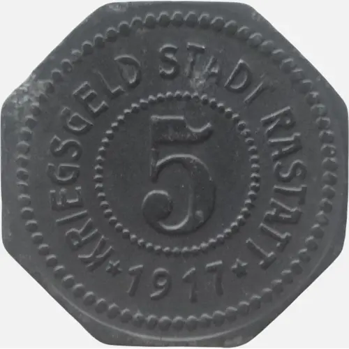 Obverse lettering KRIEGSGELD STADT RASTATT 5 ✶ 1917 ✶