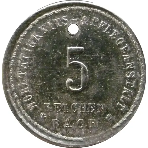 | Obverse lettering | WOHLTÄTIGKEITS= & PFLEGEANSTALT 5 REICHEN ✠ BACH ✠ |