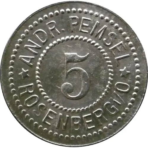 Historical Context: This 5 Pfennig coin from Rosenberg in der Oberpfalz, Municipality of, exemplifies German Notgeld. Although the year is absent, its iron composition and municipal issuer firmly place it within the tumultuous post-World War I era, likely 1917-1923. During this period of material shortages and hyperinflation, local authorities, like Rosenberg, issued emergency currency to maintain stability. 'Andr. Pemsel' likely indicates a local official or merchant involved in its authorization, underscoring the localized nature of these crucial issues.