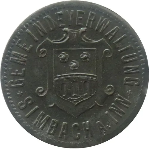 | Leyenda del anverso | GEMEINDEVERWALTUNG ✠ SIMBACH A. INN ✠ |