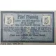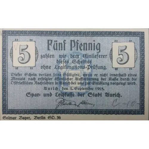 | Reverse lettering | 5 Fünf Pfennig 5 zahlen wir dem Einlieferer dieses Scheines ohne Legitimations Prüfung. Dieser Schein verliert seine Gültigkeit, wenn er nicht innerhalb eines Monats anch erfolgter öffentlicher Aufforderung der Kasse durch die Ostfriesischen Nachrichten in Aurich bei uns zur Einlösung vorgelegt wird. Aurich, den 1. September 1918. Spar. und Leibfasse der Stadt Aurich Geimar Baher, Berlin GD. 36 |