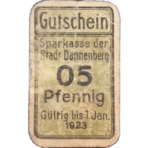 | Obverse lettering | Gutschein Sparkasse der Stadt Dannenberg 05 Pfennig Gültig bis 1 Jan. 1923 |