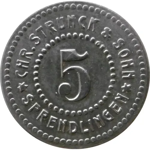 | Obverse lettering | CHR. STRUNCK & SOHN 5 ✶ SPRENDLINGEN ✶ |