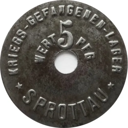 | Obverse lettering | KRIEGS-GEFANGENEN-LAGER WERT 5 PFG. ★ SPROTTAU ★ |