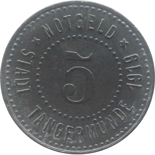 | Leyenda del anverso | NOTGELD 5 ★ STADT TANGERMÜNDE 1919 ★ |