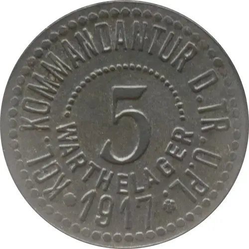 | Obverse lettering | KGL. KOMMANDANTUR D. TR. Ü. PL. 5 WARTHELAGER ✿ 1917 ✿ |